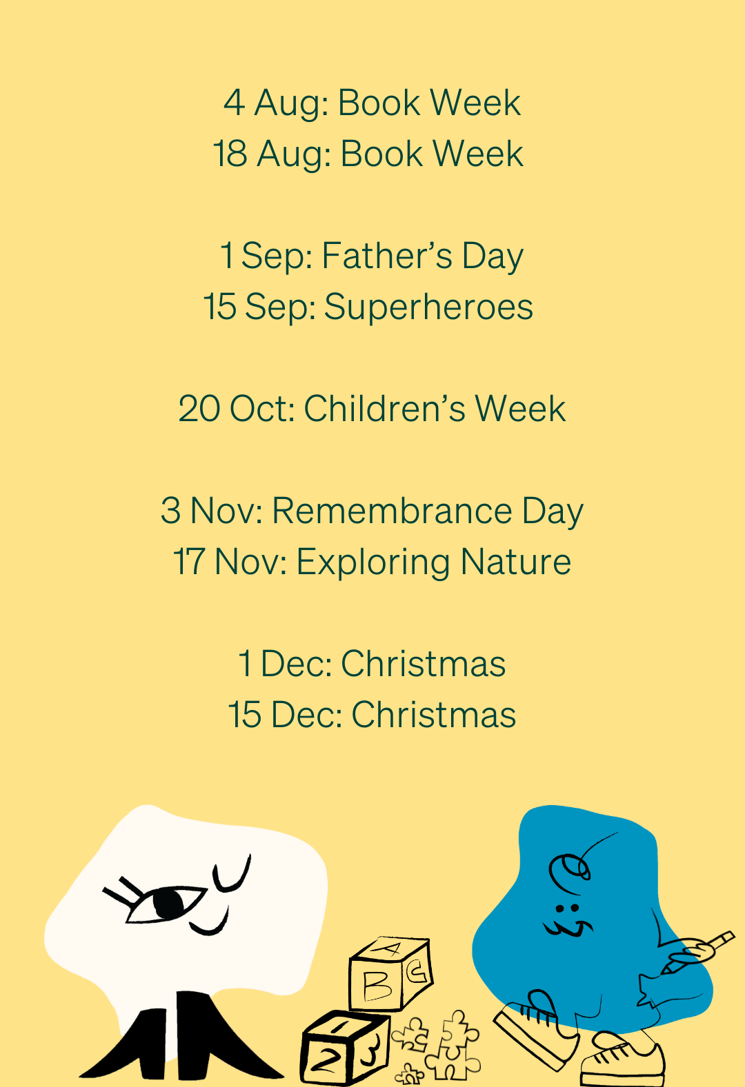 All children must be supervised by a parent or guardian. Perfect for children aged 0 - 5 years old. All accompanying adults will receive the caffeine hit required to grow our little locals into excellent humans (we'll see you at Bites and Brew)